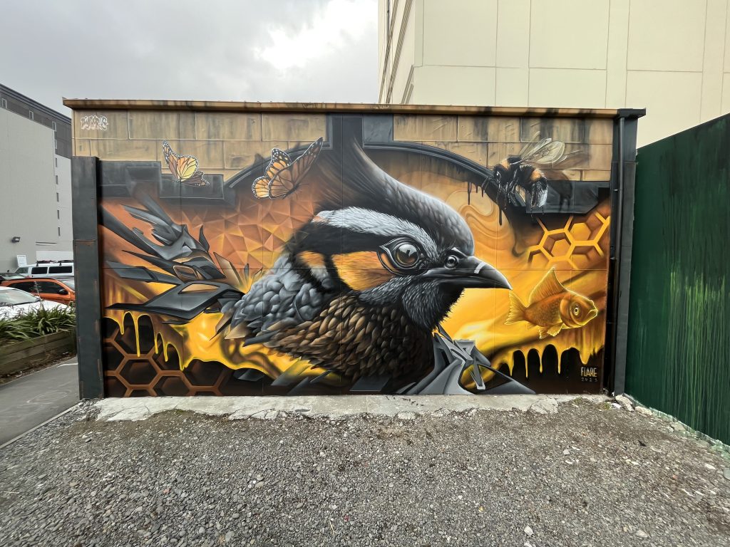 Though most of his murals reside in the north island, in 2021 he painted a collaborative mural with Sean Duffell in the heart of Blenheim, raising awareness for the Marlborough Falcon Conservation Trust (MFCT).