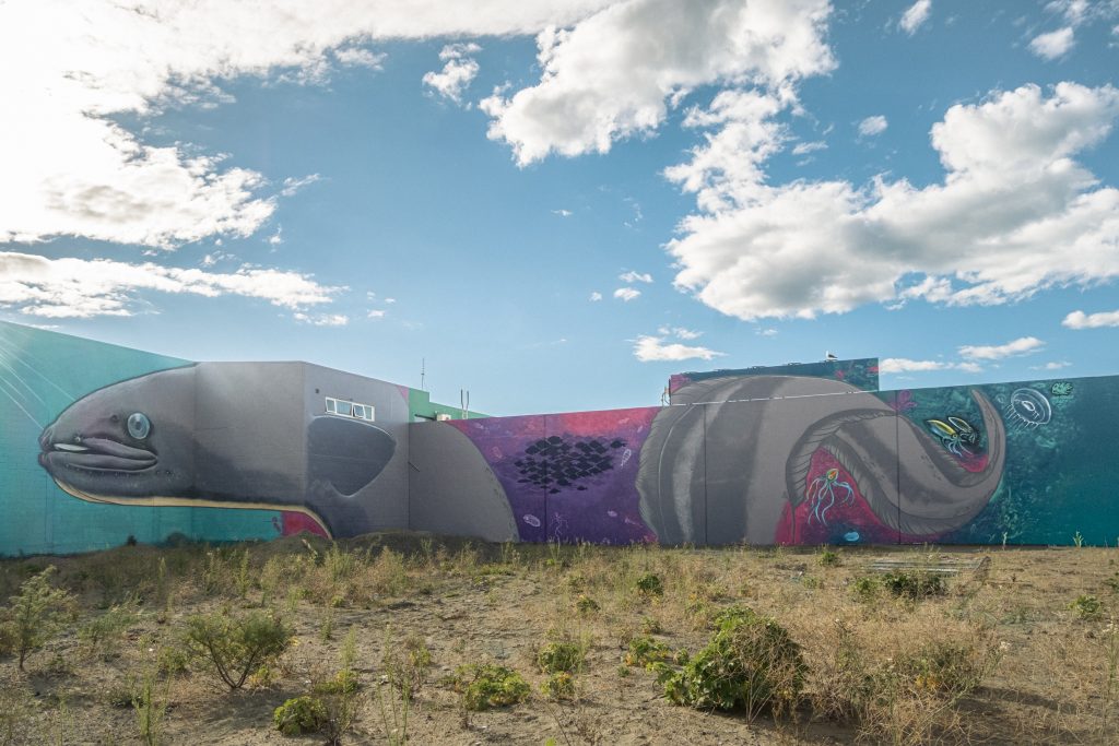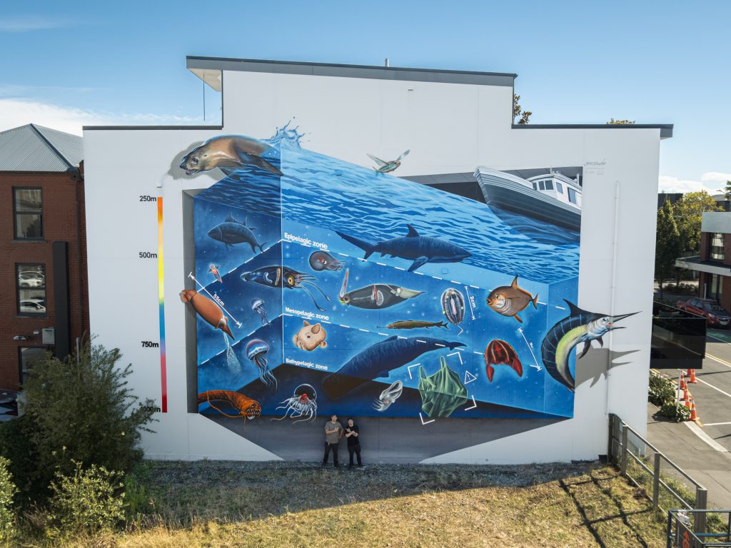 This mural tells the story of the longfin tuna (eel) of Aotearoa and its extraordinary final migration. After spending most of its life in freshwater rivers, lakes, and wetlands, the tuna begins a remarkable journey at the end of its life, travelling thousands of kilometres into the Pacific Ocean. Guided by ancient instinct, it descends into the mesopelagic “twilight zone,” where sunlight fades and darkness begins, eventually reaching its deep-ocean breeding grounds near where it was once born.