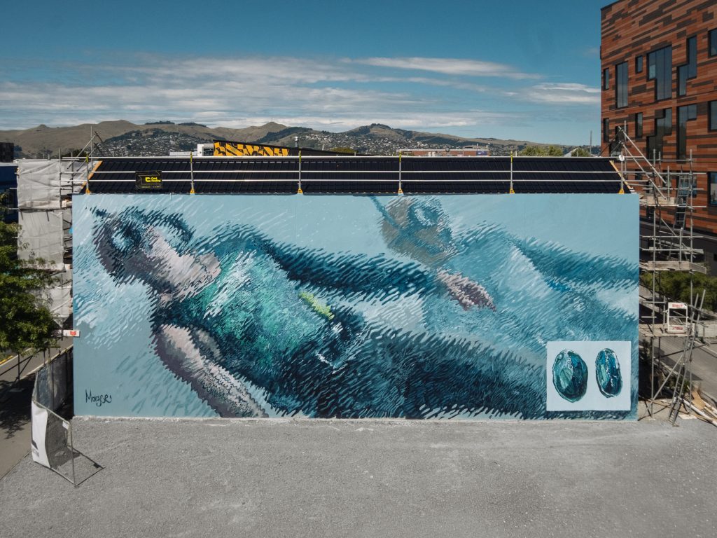 Masked Artist chose to paint the Māui dolphin, one of the rarest marine mammals in the world. Small, playful, and found only off the west coast of Aotearoa, it’s the smallest species of dolphin on the planet, living right here in our own backyard.