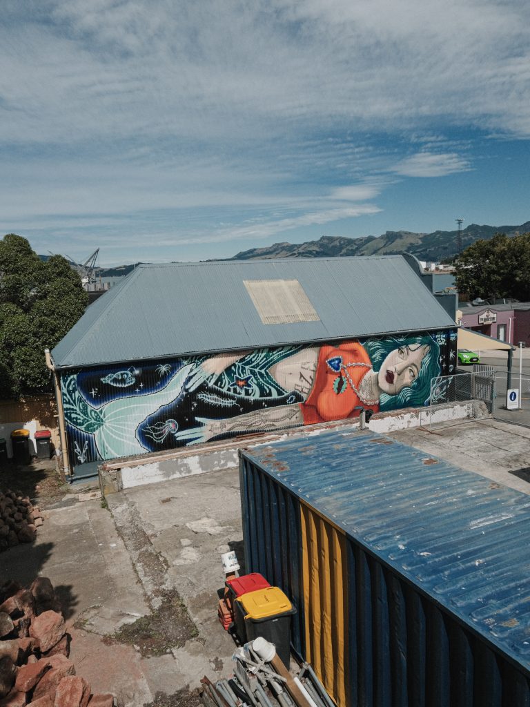 The work is layered with subtle references to Lyttelton’s history, hidden as visual easter eggs throughout the composition. The mermaid herself is inspired by Lyttelton local and tattoo artist McChesney-Kelly Adams, grounding this otherworldly narrative firmly within the community.
