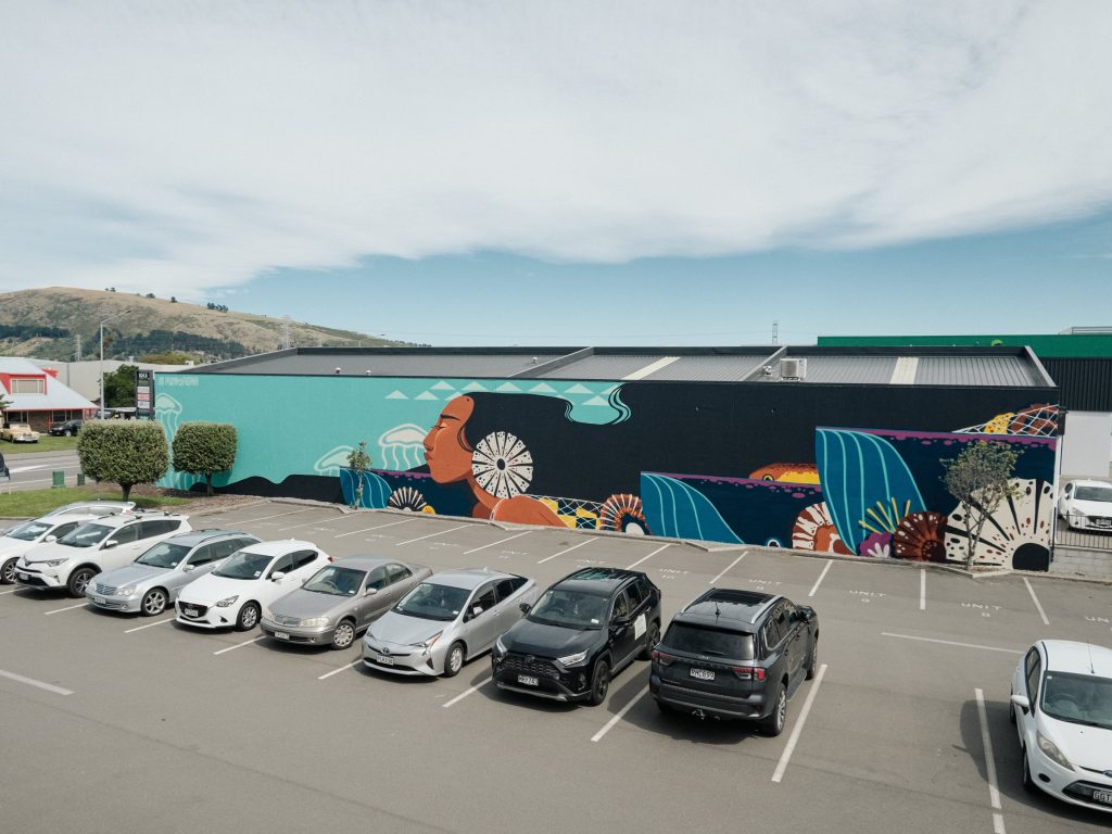 This mural speaks to the conservation and protection of kai moana across Te Waipounamu through the enduring cultural practice of rāhui. Rāhui is a traditional system used by our ancestors to allow ecosystems time to rest, recover, and regenerate, ensuring balance across the skies, land, and sea.